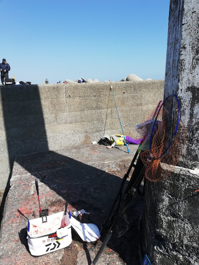 昼過ぎに上げ潮に変わると足元に30cmくらいのメジナが見えるようになったのですが、潮は動かないし澄潮、さらに真水が入ったのか通常シブシブになる程度のオモリをつけるとウキがどんどん沈むような状態。魚の活性も低く、全く餌に興味を示しません。