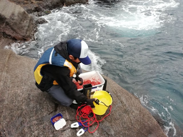オキアミは、いつもの小田原マリンターミナルさんに予約。当日5時15分くらいに到着し、コマセを混ぜます。今回は小池さんがいて、私たちがお店で混ぜるか磯で混ぜるか相談していると「ここで混ぜていった方がゴミが出ないですよー」と勧めてくれたので、水を入れる前まで、お店で作っていくことにしました。