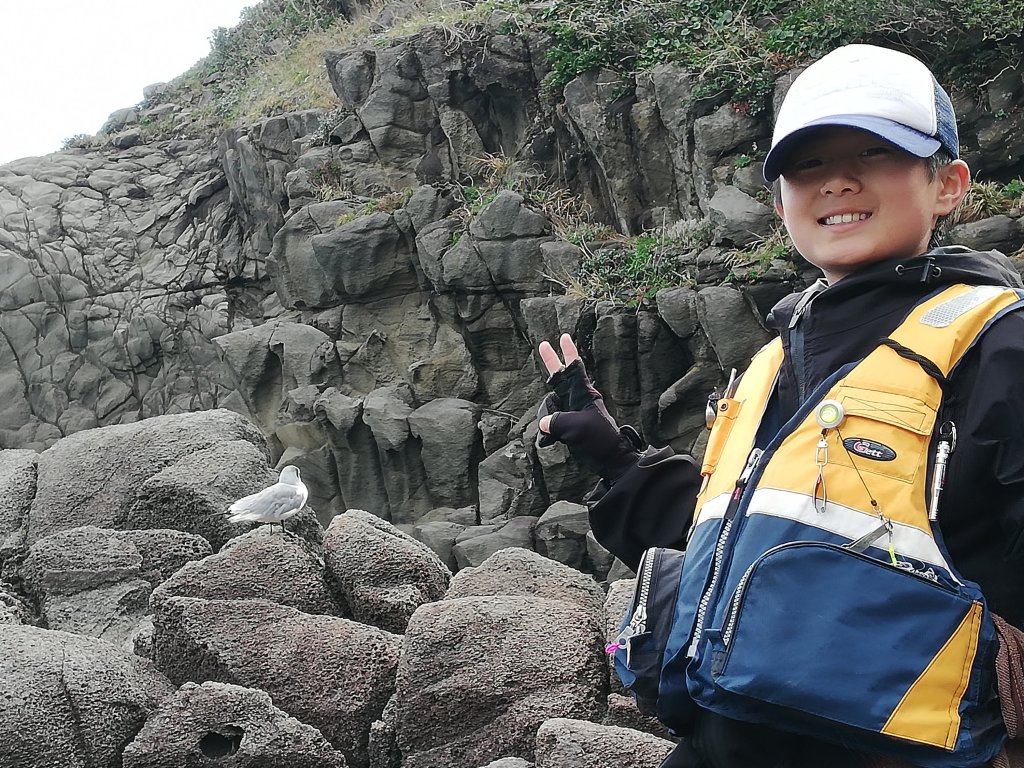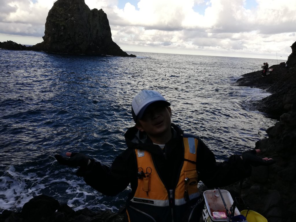 息子は、「ボウズは回避できた」と休憩をとってから釣りを再開。その頃くらいから南側から崖の間をすり抜けてくる暴風が吹き、仕掛けの回収だけでなく体があおられ、立って釣りをするのも危ない感じになってきたため、息子と二人で磯に座って釣りをすることにしました。風が強くて仕掛けを入れるのは難しい状態。向かいの京の字の方のバッカンが風にあおられたのか海に流されていきます。たまらず息子は岩影で体を丸めて釣り中断。私も座り込んでいますが、せっかくなので足元の浅いところに仕掛けを入れてみます。すると強風で仕掛けが馴染みにくいのに少し早く仕掛けが馴染んだようにゆっくりウキが沈んでいきます。何処までも沈んでいくので念のためあわせると重量感のある引き。