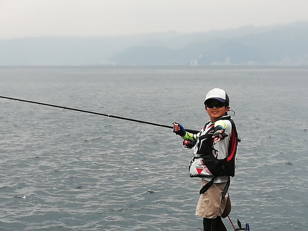 この状況が昼頃まで続き、潮が上げに変わった頃、「パパ!なんか大きいのが来たよ!」と言って息子が竿を曲げています。自分でタモ入れできないかもとのことで、ヘルプに向かいます。息子があまりに大声で叫ぶので、両隣の釣り人応援してくれます。右隣のどこかのテスターらしき人は「竿を右に倒してー」とかやり取りのアドバイスも。あがってきたのは…