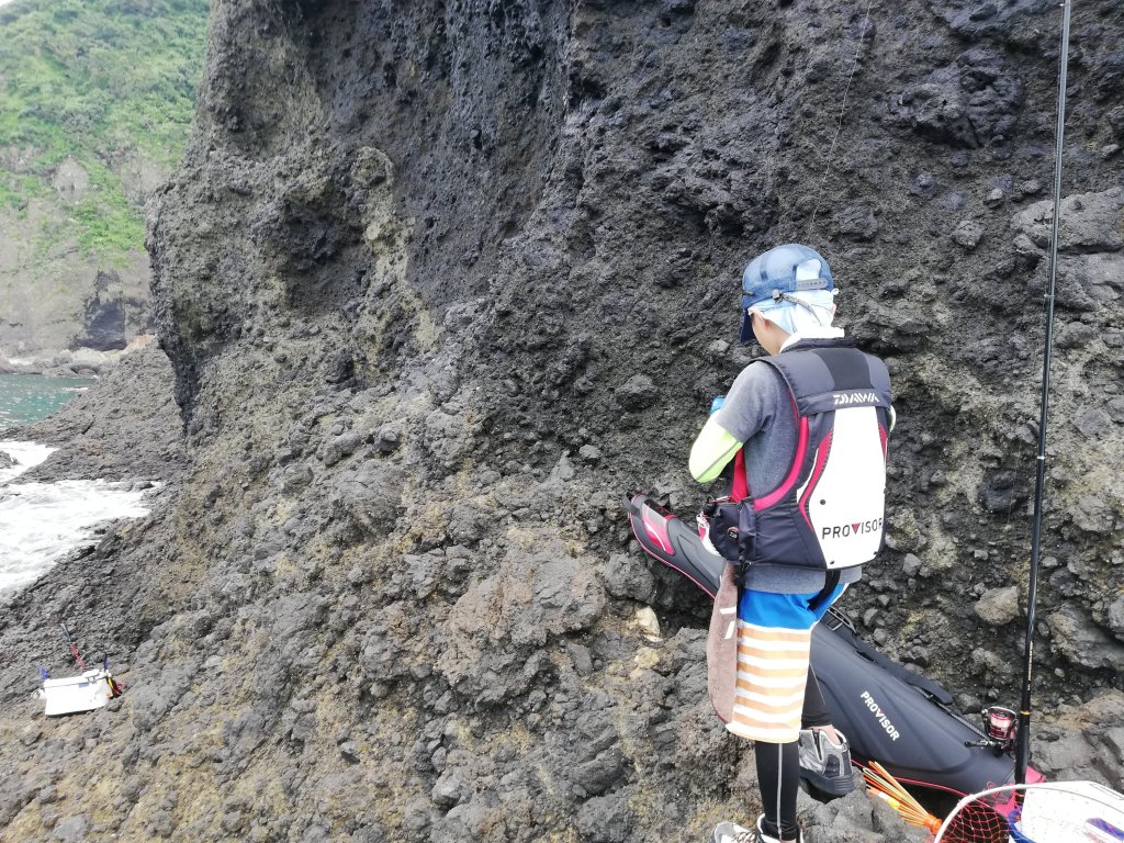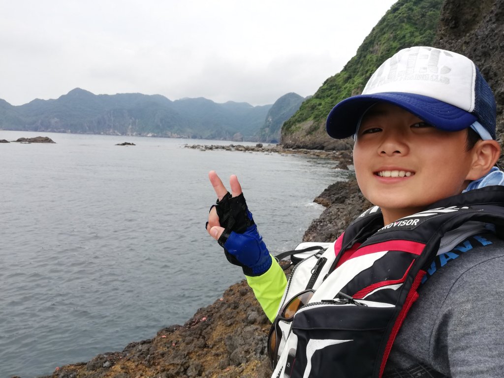 翌朝、初めての中木。3隻の渡船が全速力で各磯を回ります。息子はそのスピードにびびりまくり。最後に足場がよさげな場所おまかせでのせてもらった磯は釣切。目の前の島のお陰で波も安全そうだし、まずは安全第一で。