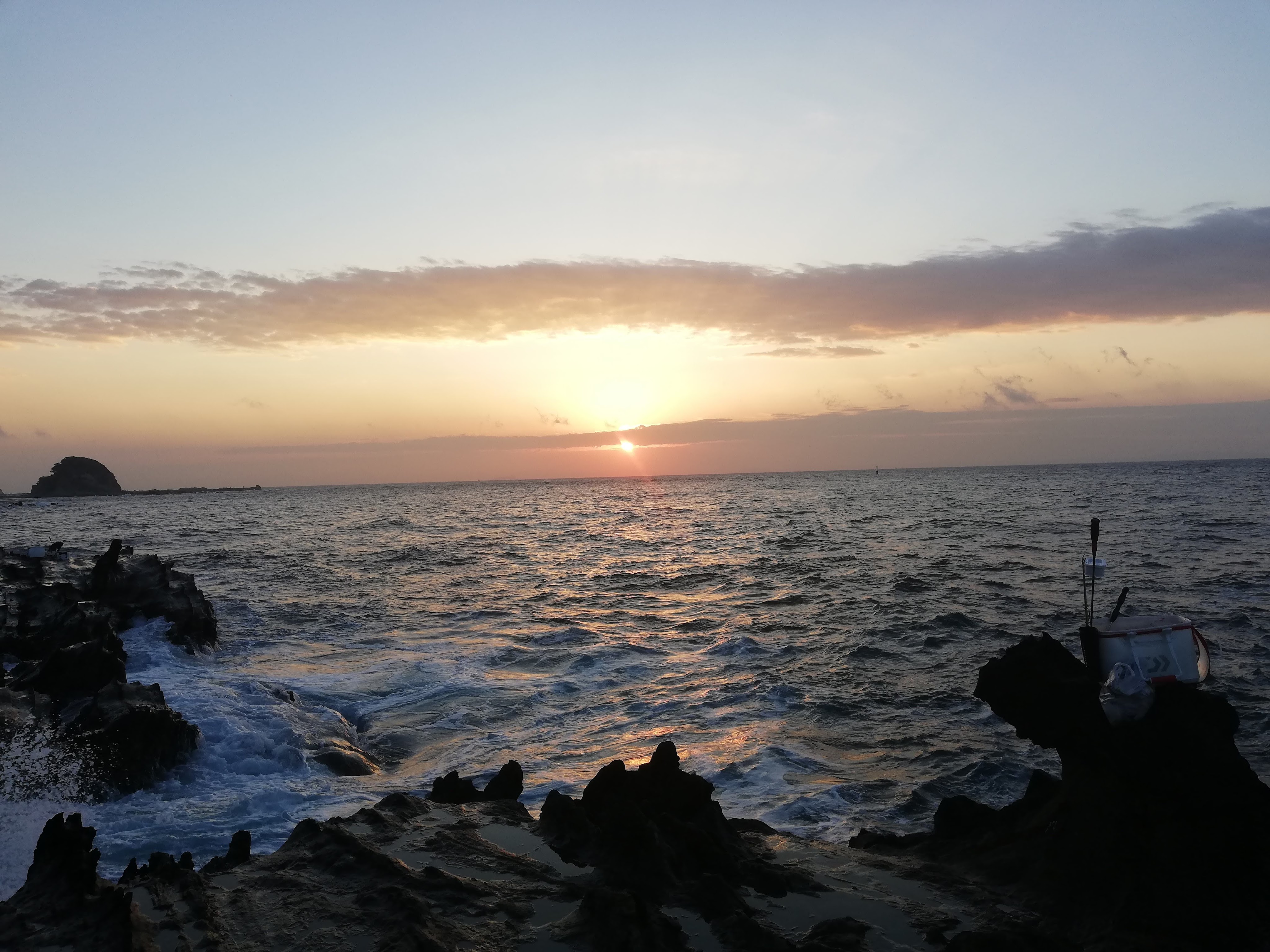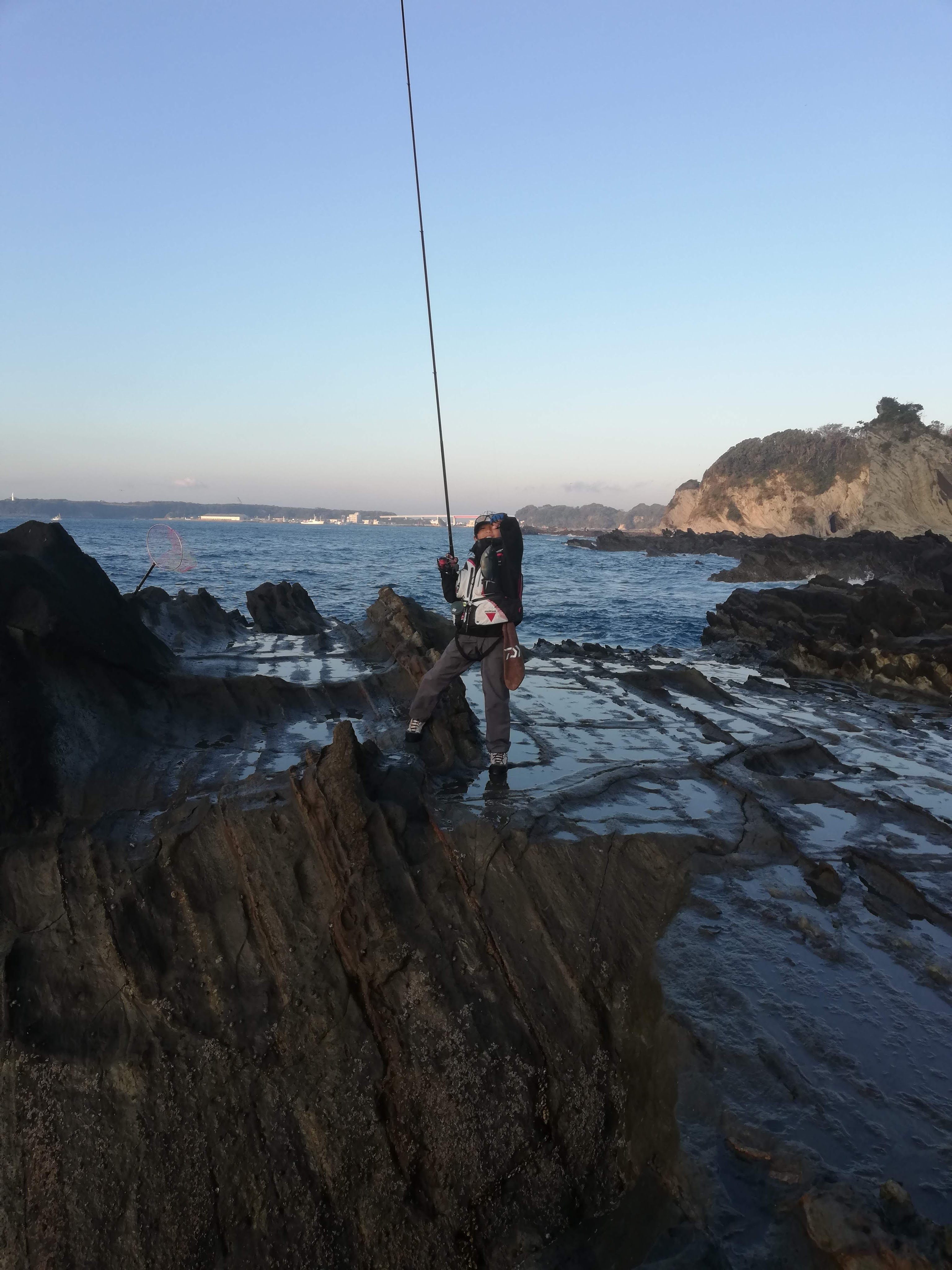 今回は駐車スペースからの距離もあるので少し早めに出発し、5:15には最寄りの毘沙門港に到着。荷物と息子をそこで下ろし、私だけ宮川公園の駐車場へ車を止めに戻る作戦。磯に到着したのは夜明け前の5:50くらいでしたが、すでに先行者が2名。以前よりは少し人が減ったかもしれません。