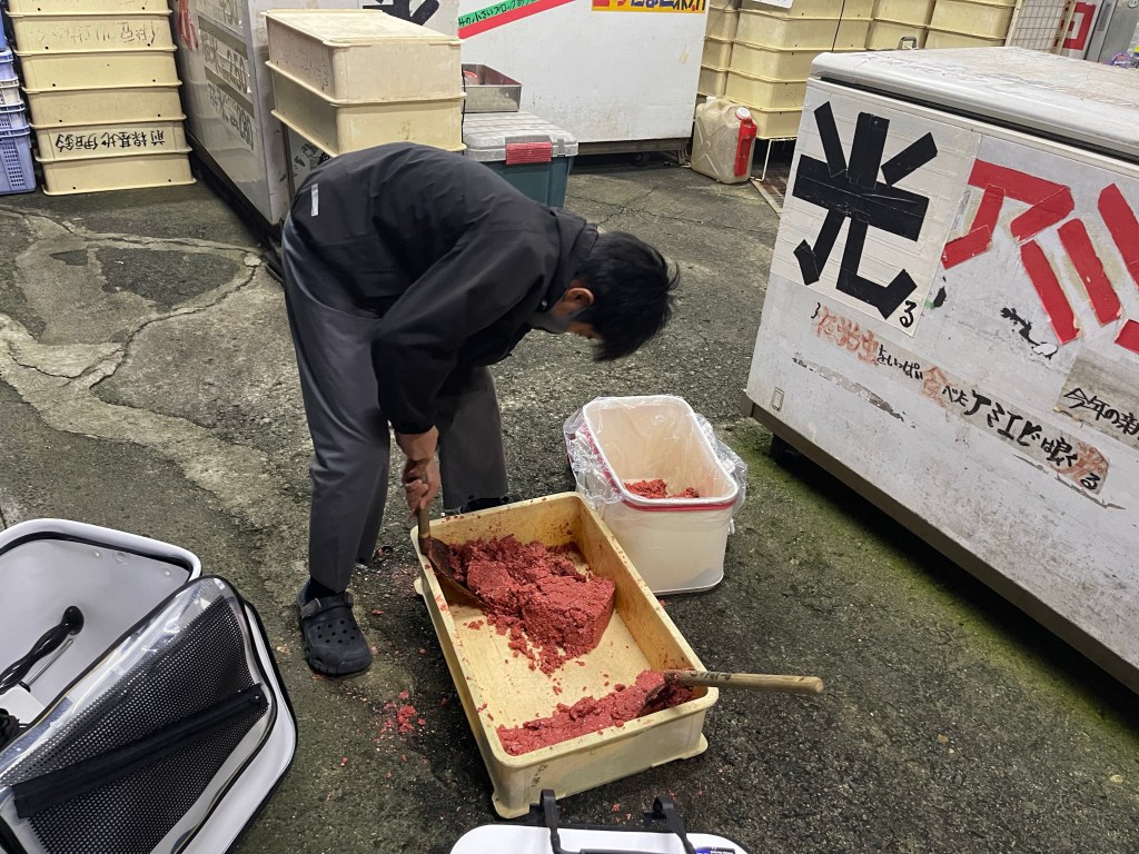 息子は餌作りも好き。伊豆釣り餌センターで私に撒き餌まで作ってくれます。