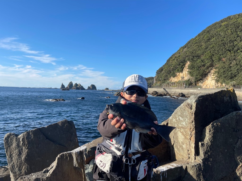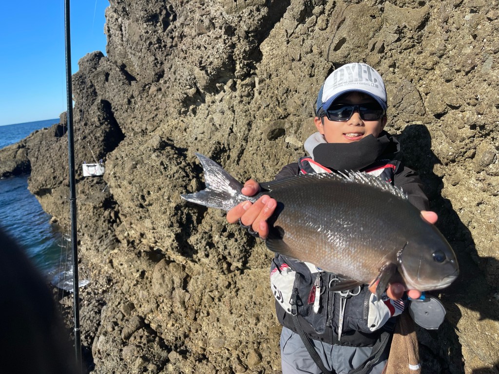 その後,私が37cmのメジナ、30cm強のメジナx2を釣りますが、息子は小さいハマフエフキなどがかかり苦戦。急に水温が下がったせいか、全体的に食いが渋く、寒グレらしい微妙な当たりを捉えるのに四苦八苦しています。これまで夏のオナガの強烈なあたりに慣れたせいかもしれません。これから釣りを調整して行く必要がありそうです。