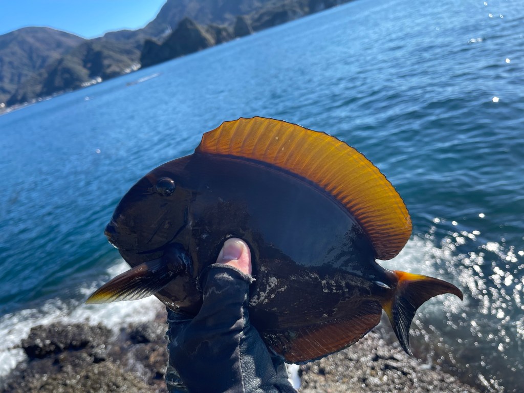 その後も潮が動かず苦戦しますが、色々な魚が釣れました。ベラ、カサゴ、アイゴ、サンノジ、アオブダイ(40オーバー)、ブダイ、ツノがあるハコフグ(ウミスズメ?)など。他にも